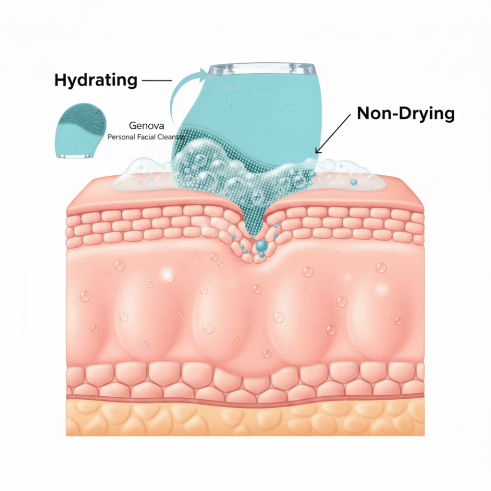 Genova’s Personal Silicone Cleanser uses soft silicone touchpoints, which are designed to be gentle on the skin while providing a deep cleanse. The device is suitable for all skin types, including sensitive skin.